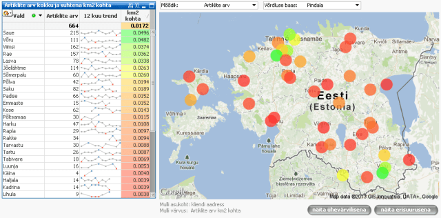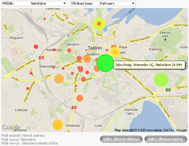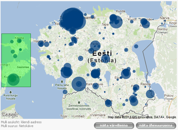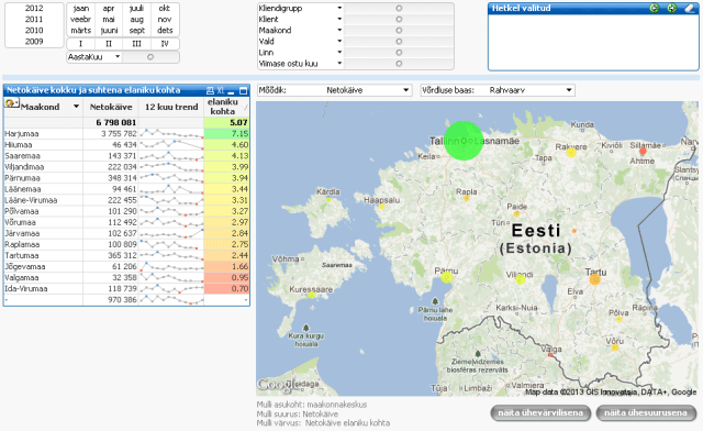 Alloleval kaardil on märgitud maakonnakeskused; punkti suurus tähistab netokäivet; punkti värvus tähistab netokäivet elaniku kohta (sama värviga on lahtrid kõrvalolevas tabelis). Tabeli kohal olevast nupust saab maakonna asemel võrdlusse võtta vallad või kliendid. Kaardi kohal saab vaheta mõõdikut (netokäive/müügikate jne) ja võrdlusbaasi (rahvaarv/pindala). Kaardi all olevate nuppudega saab muuta punktid ühesuuruseks või ühevärviliseks, nii nagu hetkel vaja.