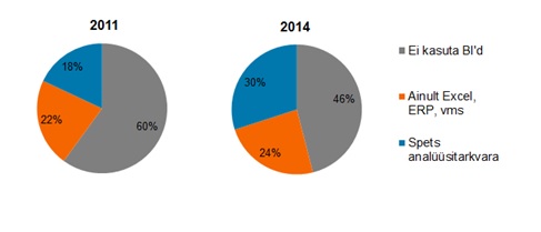 Kolme aastaga on 12% kasvanud nende ettevõtete hulk, kes teevad oma analüüse selleks ettenähtud tööriistadega ning kasutavad mõnda spetsiaalset analüüsitarkvara. Kui 2011 aasta uuringus väitis 18% küsitletutest vastava tarkvaraplatvormi kasutamist, siis 2014. aastal on neid juba 30%. Ülejäänud analüüsivad oma andmeid ainult Excelis, kasutavad selleks majandustarkvara laiendusi või omaloodud programmijuppe või ei analüüsi üldse. Suuremates ettevõtetes kasutatakse valdavalt kahte või enamat analüüsitööriista. 96% BI’ga tegelejatest kasutab Excelit ning üle poolte neist siis lisaks mõnda analüüsitarkvara. Enimkasutatav spetsiaalne ärianalüüsitarkvara on QlikView, mille kasutamist mainis 25% BI’ga tegelejatest ning seda on 14% enam, kui kolm aastat tagasi.