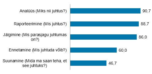 54% Eesti suurematest ettevõttest tegeleb oma väite kohaselt ärianalüüsiga, kuigi spetsiaalseid ärianalüüsi tarkvarasid kasutab ainult 30% küsitletutest. Mida suurem ettevõte, seda enam kasutatakse otsuste vastuvõtmisel analüütikat – nii näiteks sihtgrupis käibega üle 6,4 mil euro analüüsivad oma andmeid 65% ettevõtetest ja sihtgrupis üle 32 mil euro 79% ettevõtetest. 19% vastajatest tõdes, et nad küll ei kasuta veel BI’d, kuid peavad seda vajalikuks ning 5%’l on juba vastu võetud otsus sellega tegelema hakata. Huvitav on asjaolu, et ka üle 32 miljonilise käibega ettevõtete seas leidus 3% selliseid vastajaid, kes ei pidanud äriliste otsuste langetamiseks analüüsi üldse vajalikuks. Enimlevinud põhjus, miks BI’d ei kasutata on vastava inimese puudumine (37,7%) ja ainult 13,8% vastajatest tõi põhjuseks ebapiisavad rahalised vahendid.