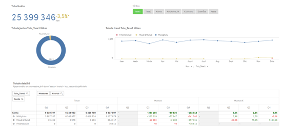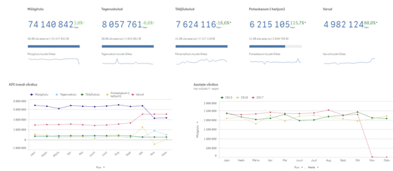 Juhtimislaual on vaikimisi mõõdikutena toodud muuhulgas müügitulu, tegevuskulud, puhaskasum ning nende trendid, kuid loomulikult saab neid mõõdikuid vahetada vastavalt teie ettevõtte vajadustele ja eesmärkidele. Samuti on siin hea võrrelda erinevate allüksuste, osakondade, tütarettevõtete tulemusi ning samas näha ka grupi tervikpilti.
