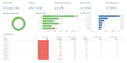 Lehel Võlglaste töölaud saab kasutaja ülevaate laekumata arvetest ja klientide üldisest maksekäitumisest. Töölauale on kokku toodud ettevõtte võlglaste info – kliendid, nende arved ja laekumised, millele on lisatud antud klientide Krediidiskoor ning selle trend. Infot saab analüüsida nii võlas olevate arvete, klientide, võla pikkuse kui ka Krediidiskoori vaates, ohus olevad summad on KPI’dena kohe näha. Nii saab ettevõtte finantsjuht hinnata klientide krediidiriske ettepoole vaatavalt – kõige enam ohus olevad summad ei pruugi olla kõige suuremad või pikemad võlglased. Vaata Võlglaste töölaua kohta pikemat infot siit.