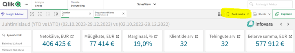 Järjehoidjate kasutamine on mugav ja kiire viis alustada oma analüüsi alati õigest hetkest. Kui sa vastutad mõne konkreetse valdkonna eest – olgu see osakond või tootekategooria, müügikanal või kliendigrupp, või sa muul põhjusel kasutad tihti samu filtreid Qlikis analüüse tehes, siis on mõistlik need valikud salvestada järjehoidjana. Nii saad analüüsi alustades liikuda kohe lehele, kus õiged valikud on juba paigas. Eriti oluline on järjehoidjate kasutamine «Tee ise» aruande juures.
