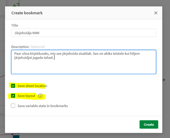 - Seejärel avaneb Create Bookmark aken, kus tuleb täita järgmised valikud: